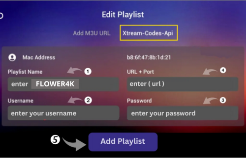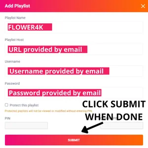 Step 5: Enter “FLOWER4K” as the Playlist Name in the first box. Then in the second, third, and fourth boxes, input the Xtream Codes login credentials (Server address (Url), Username, and Password) provided by us after subscribing. Finally, click “Submit” to proceed.